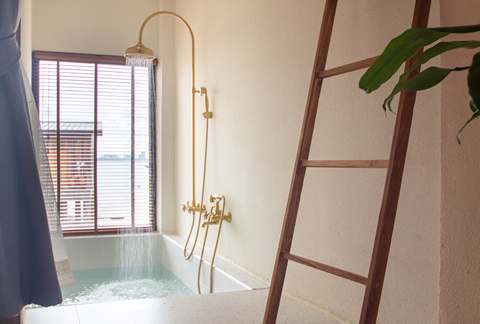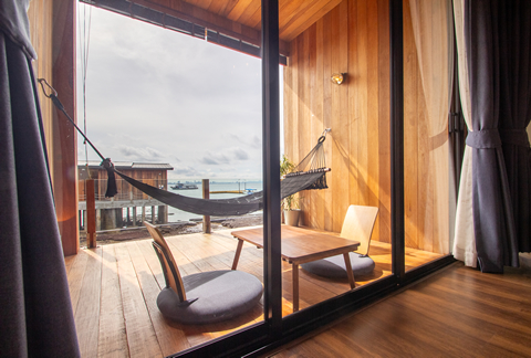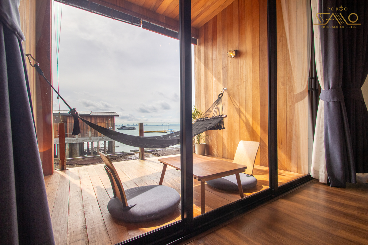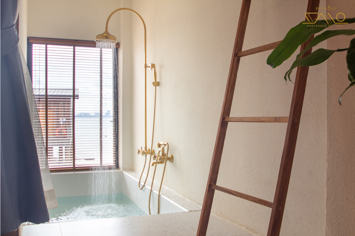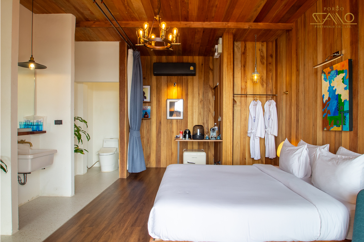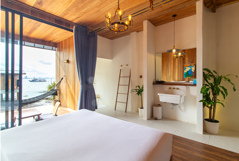 This room is located on the beachfront, the room offers stunning views of a small beach and a beautiful sea from the balcony. The room features a king-sized bed, a large bathtub, and a bathroom with a sea view.